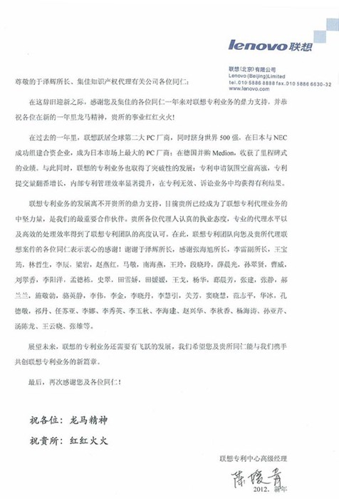 在新年即將到來(lái)之際,集佳收到聯(lián)想公司專利中心發(fā)來(lái)的新年感謝信,對(duì)集佳在專利工作上給予的大力支持表示感謝。在此,也感謝廣大客戶一直以來(lái)對(duì)集佳工作的信任與支持,今后我們將為企業(yè)提供更加專業(yè)和優(yōu)質(zhì)的知識(shí)產(chǎn)權(quán)服務(wù)。
