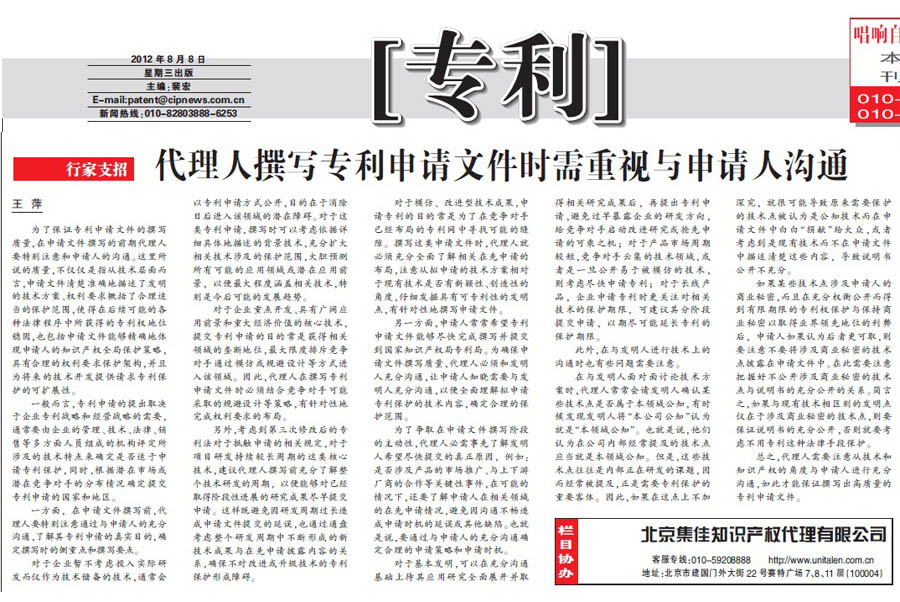 《中國(guó)知識(shí)產(chǎn)權(quán)報(bào)》:代理人撰寫(xiě)專(zhuān)利申請(qǐng)文件時(shí)需重視與申請(qǐng)人溝通