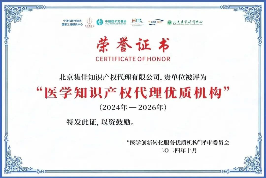 近日,2024年度“醫(yī)學(xué)創(chuàng)新轉(zhuǎn)化優(yōu)質(zhì)服務(wù)機(jī)構(gòu)”遴選結(jié)果在海口舉辦的個體化醫(yī)學(xué)研討會暨第四屆衛(wèi)生健康創(chuàng)新與轉(zhuǎn)化管理論壇上正式公布,北京集佳知識產(chǎn)權(quán)代理有限公司憑借在醫(yī)學(xué)創(chuàng)新成果知識產(chǎn)權(quán)保護(hù)與轉(zhuǎn)化方面的優(yōu)秀成績,榮獲2024年度“醫(yī)學(xué)知識產(chǎn)權(quán)代理優(yōu)質(zhì)機(jī)構(gòu)”稱號。